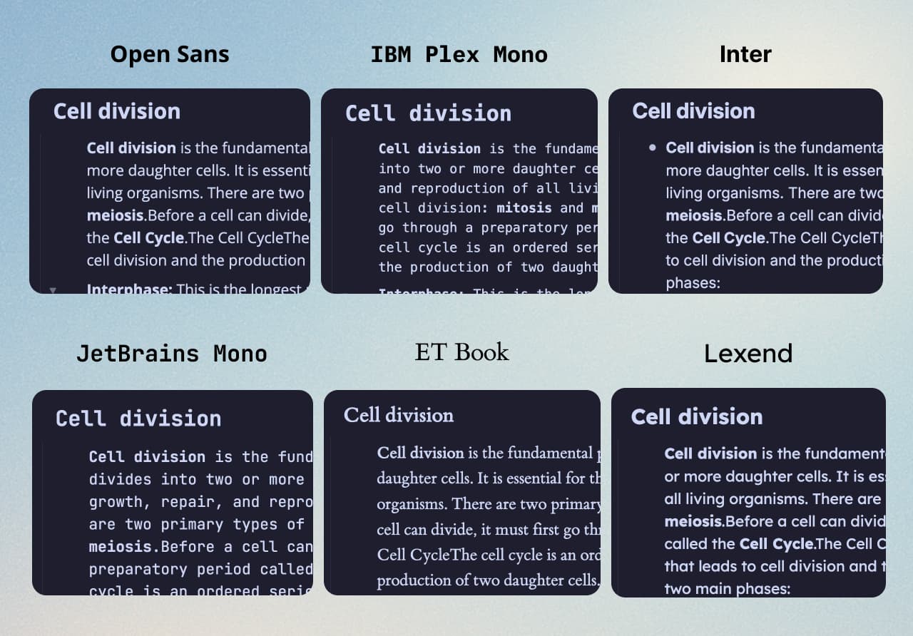 Six new fonts to make Workflowy feel more like home: ET Book, IBM Plex Mono, Inter, JetBrains Mono, Lexend, and Open Sans.