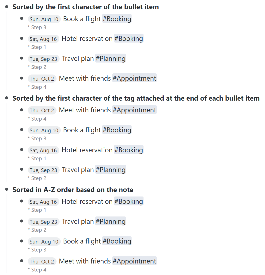 The current “Sort A–Z” option always sorts bullets based only on the first character of each item. However, if I put a deadline at the start and a category tag at the end of the item, there’s no way to sort them by category. Since the sorting is always based on the first part of the item (e.g., date), it becomes limiting. It would be useful to have a sorting option based on tags that appear at the end of the item, or at least have an option to sort A–Z by “note” content instead.