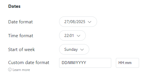 Initially I had a custom format d-MM-YYYY (ddd) But I figured it might be hard to check for the many ways a EU format could be entered. So I picked an existing option (using the drop down next to “date format”. I figured all the default available EU formats should work as expected anyway.