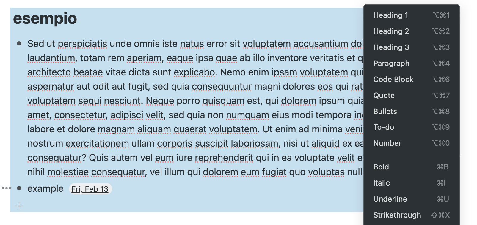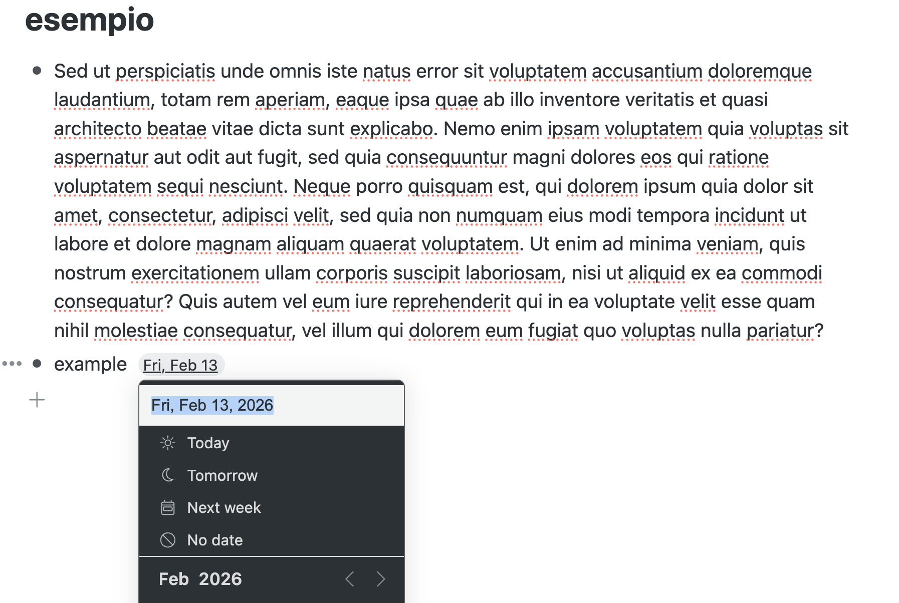 - When I’m trying to select the date on the date selector (command + A), the date is not selected anymore (as it did until yesterday and still does on the Mac app) but the whole text behind it is selected.