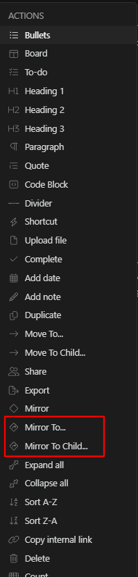 Similarly to “move to” keyboard shortcut, I would love to have one for mirror to… My usecase: When I find myself planning and mapping stuff out, I might want to send a section to my Kanban or backlog without interrupting my planning/brainstorming flow. Being able to quickly just send stuff off to the right place would be super cool.