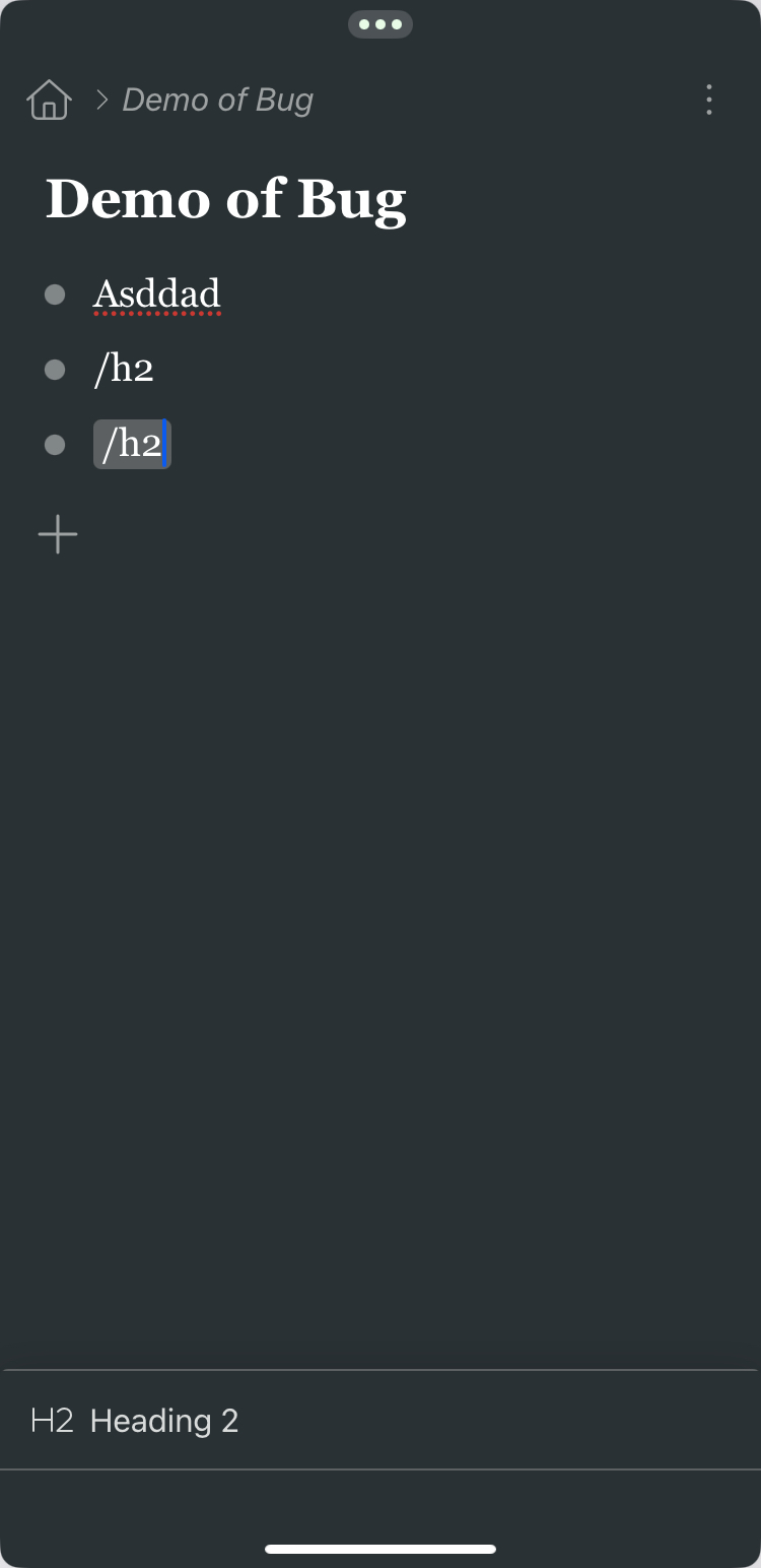 Also occurs when typing extra (starting) characters to narrow list, yet these remain as normal text when attempting to make the selection according to Workflowy documentation. Occurs regardless of virtual or external keyboard. Web version seems fine - Does not occur across several browsers (broadly and briefly tested on the iPad). This has been a persistent issue across many updates of the app and OS.
