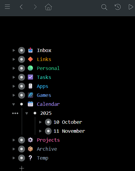 - Daily - Node that holds my main ‘view’. It’s what’s open in a tab most of the day.