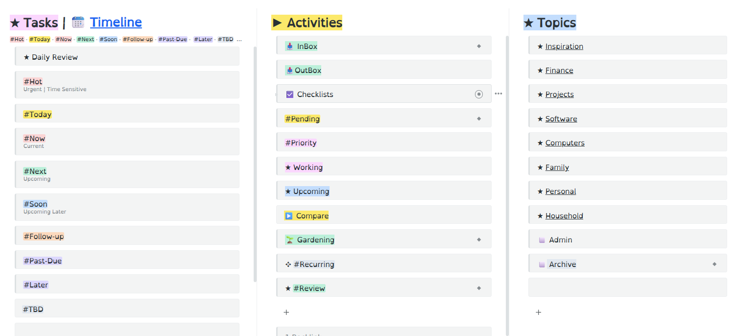 However, the main hub for all my daily activity is a dashboard I’ve created for task management which works very well for my purposes. The main benefit is that by working from this “task hub”, I’m usually only 1-3 clicks away from any current task within my database.